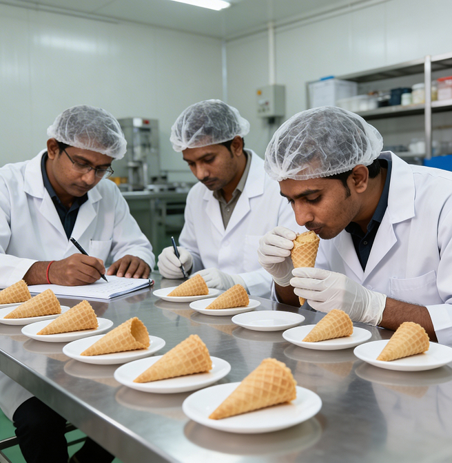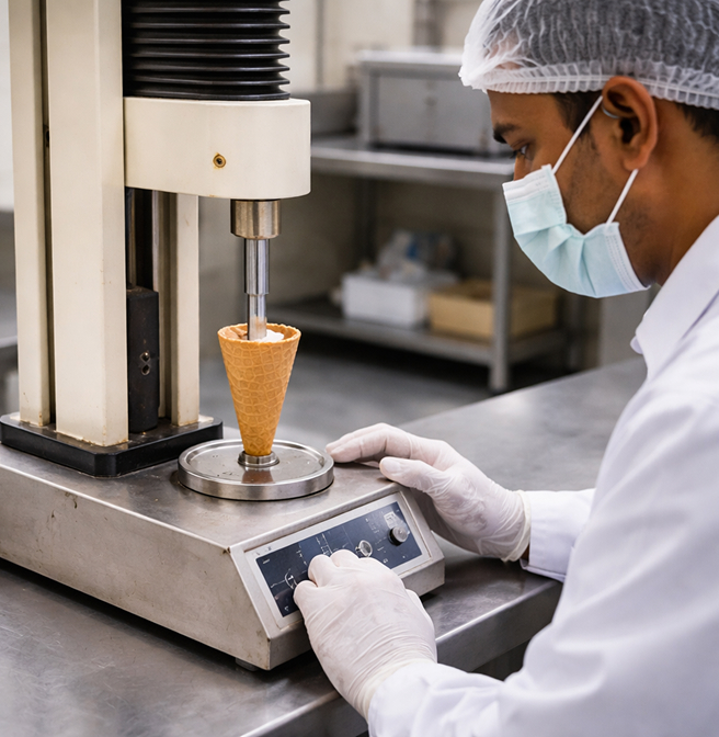 Crunch retention tests help evaluate how long the cone maintains its crisp texture rather than softening quickly.